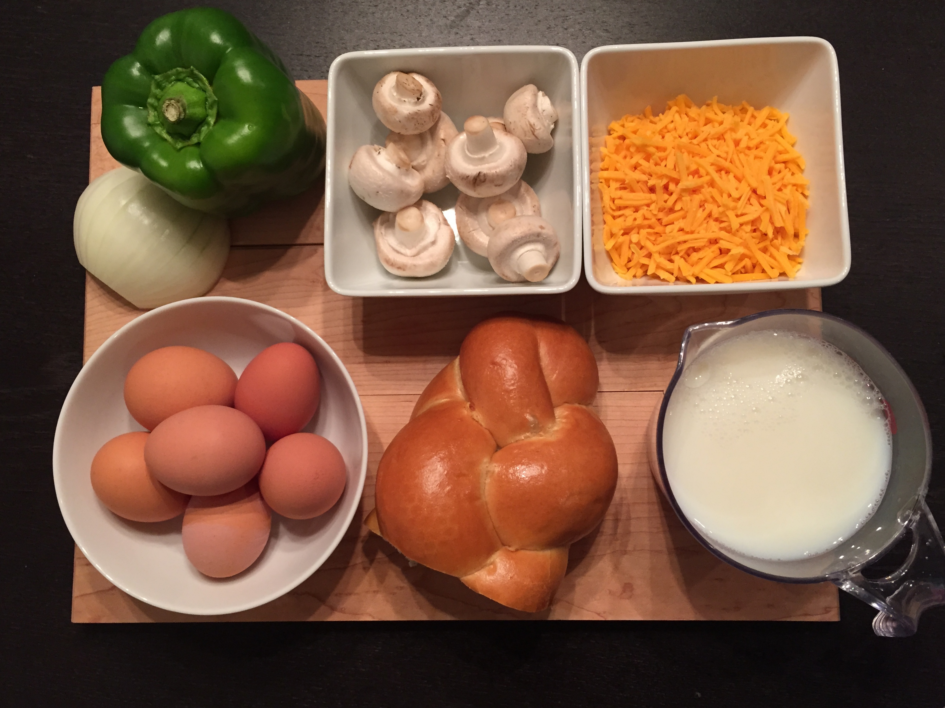 5. Pour eggs mixture over bread, cheese and veggies in pan. Cover with foil and refrigerate overnight.