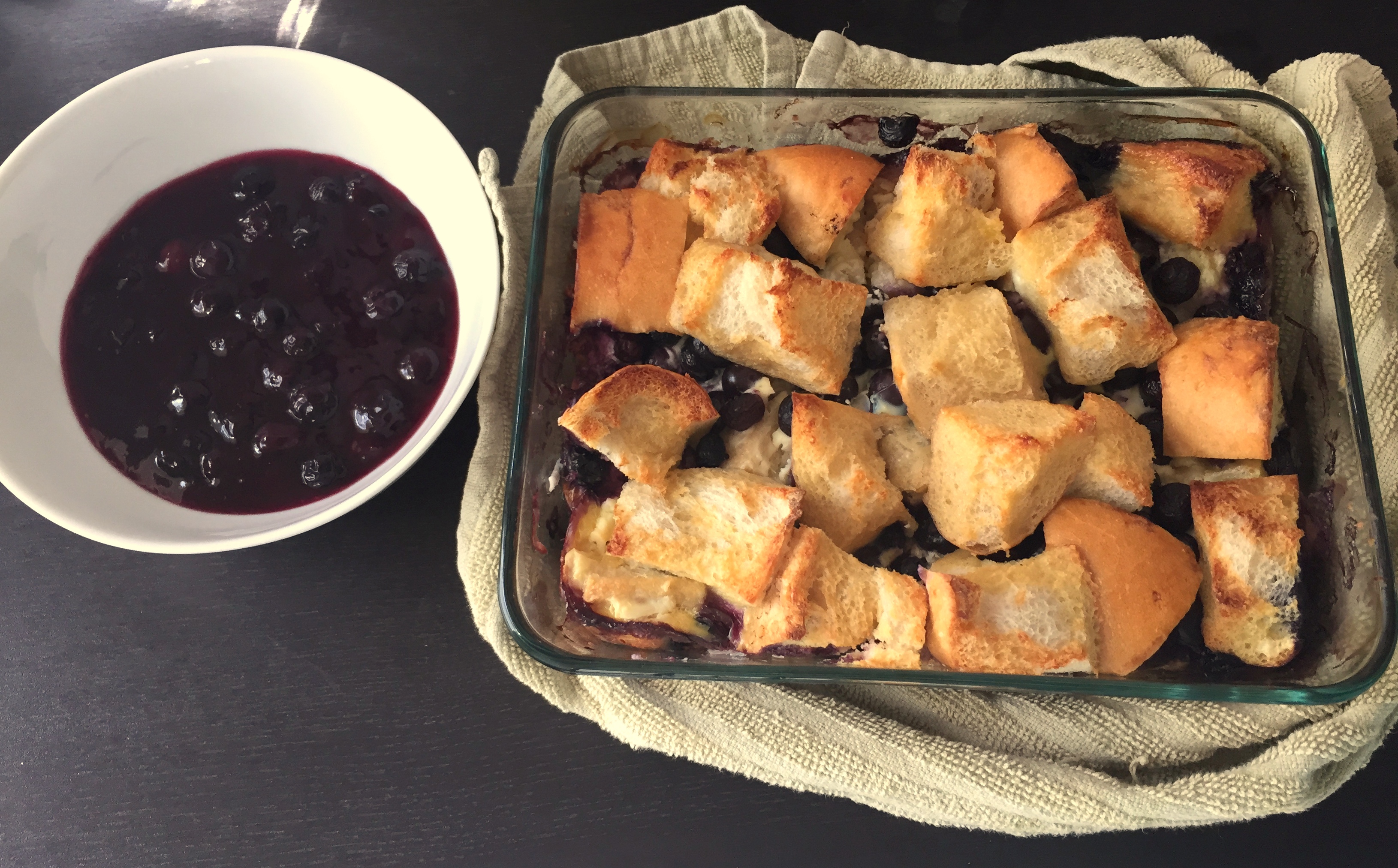 Some friends were helping us do some landscaping so I decided to make them breakfast as repayment for their kindness and hard work. Doing yard work in Texas… in July… deserves a very special treat. One of our friends really loves blueberries so I decided to try this recipe with a few changes. It’s a nice delicately rich and sweet side dish to a savory breakfast. Enjoy!
