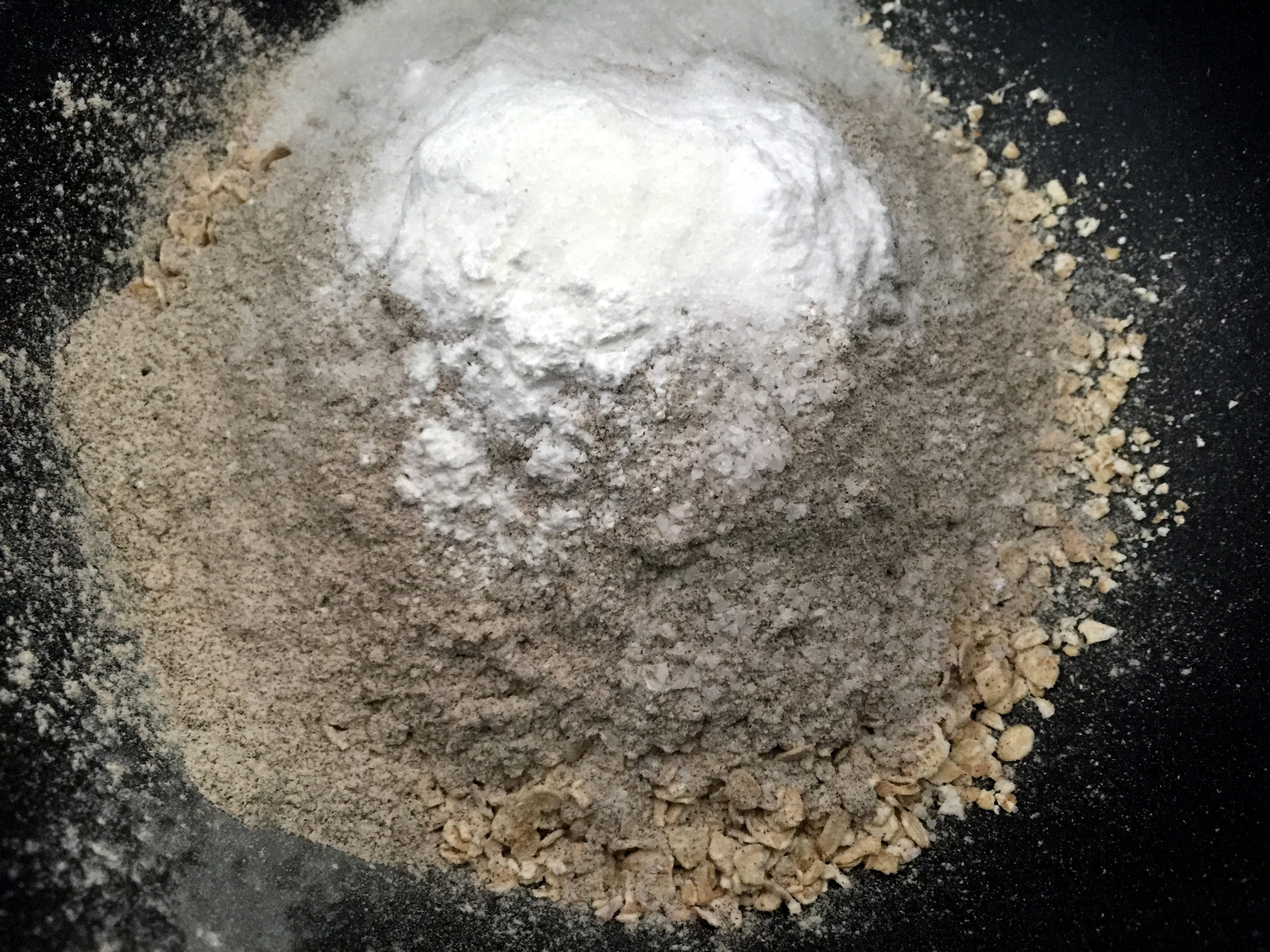 - In a large bowl, mix dry ingredients (buckwheat flour, oats, baking powder, baking soda, salt, sugar).