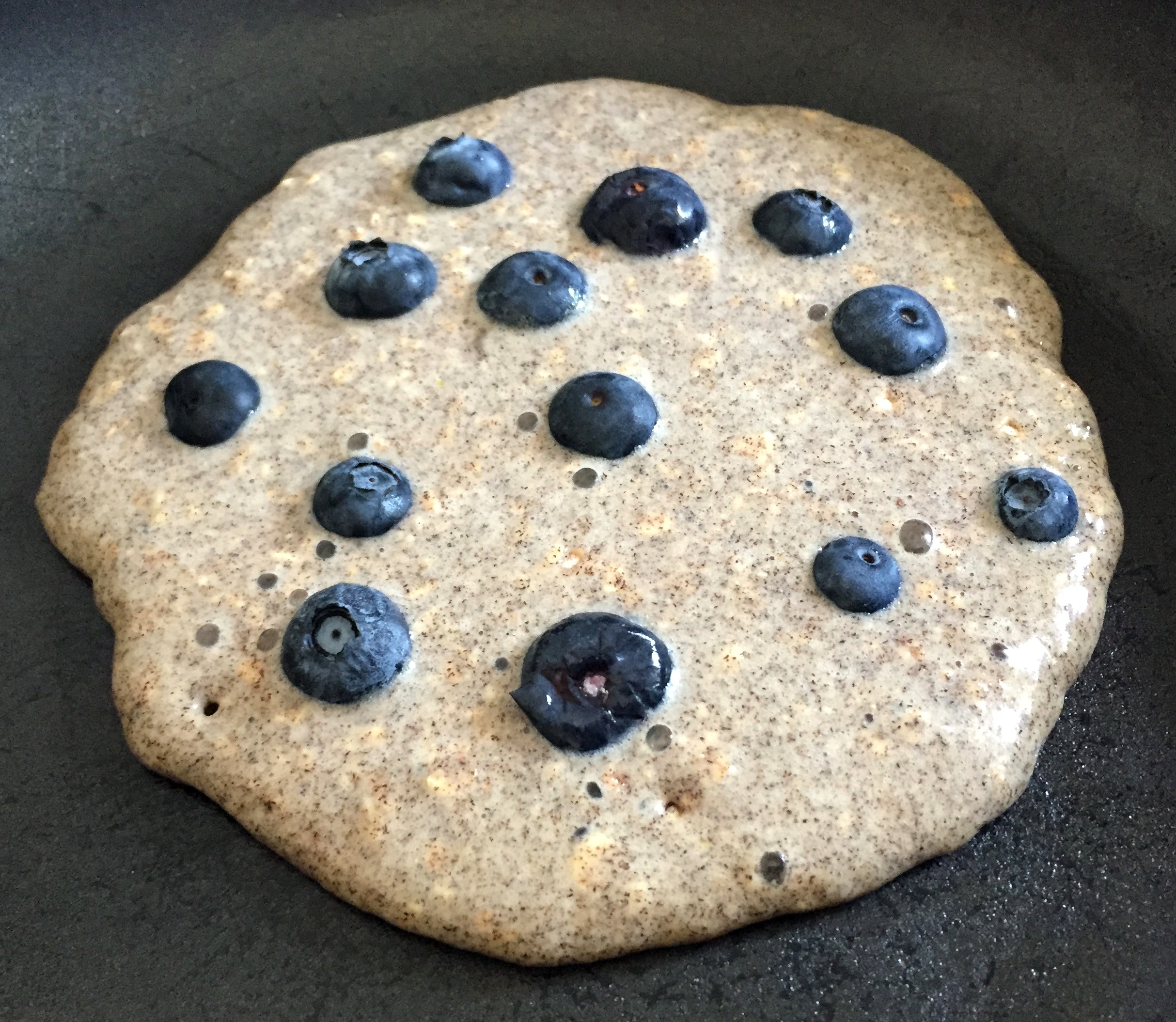 - Using a non-stick pan, add a little butter to the pan to coat and 1/4 c batter. Add blueberries to the pancakes and cook until bubbles form and edges lift from pan. Flip and cook for another 2 minutes until cooked through.